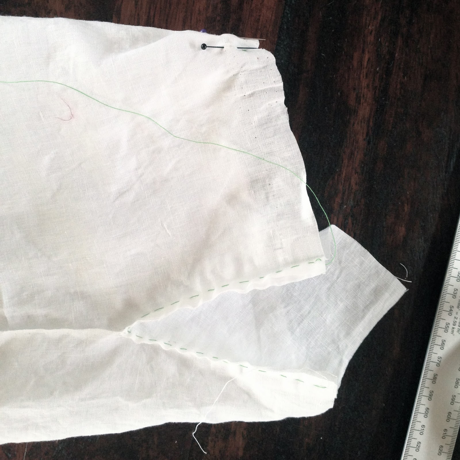 | Now the sleeves need to be gathered to fit the main pattern piece. There are 30 sm that need to be gathered down to 20 cm. Since I wasn't using a machine I made tiny folds instead of gathers and pinned them down, but gathering by machine is also very acceptable. Once this is the correct measurement the sleeves can be sewn to the main piece. And then finally the long side seam and |